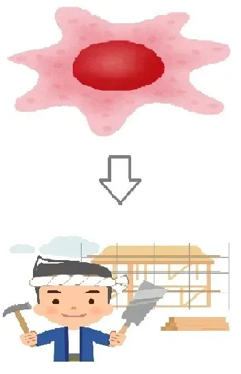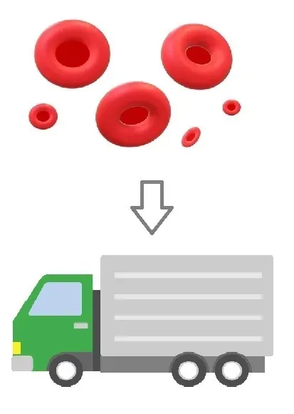 まず上の図の様に体の中の血管を道路だと仮定し、そして血液(ヘモグロビン等)がトラックだと仮定します。更に体を治す細胞を大工さんだと仮定します。