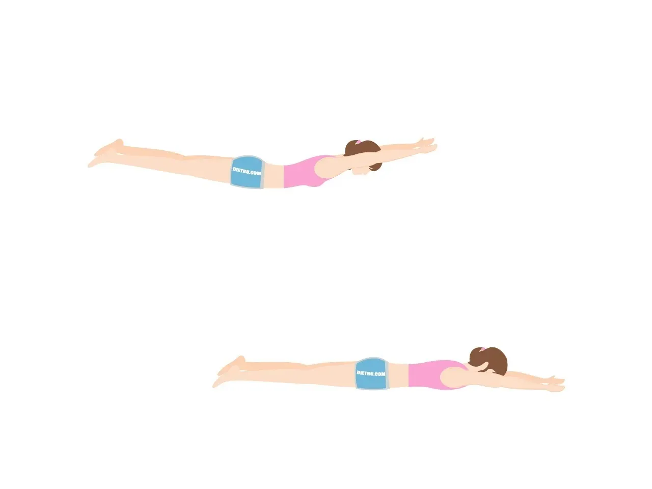 まずうつ伏せの状態で両手両足を伸ばします。その状態から上の図の様に、ゆっくりと上半身と下肢を浮かせていきます。この時にお腹が床から離れる位反らしてしまうと、腰痛の悪化に繋がる場合があるため気を付けましょう。上の図の角度位になるまで、上半身と下肢を3秒位かけて反らしていき、頂上で3秒程停止したら、また3秒程かけて降ろしてきます。これを10回2セット程度行っていきます。