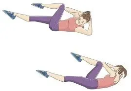 上の図の様に上半身を上げた状態で、頭の後で手を組み左の肘と右の膝を合わせにいきます。ゆっくりと合わせたら、次は右の肘と左の膝を合わせにいきます。これを交互にゆっくりと5回ほど繰り返し、一度上半身を下ろします。10秒程度休息をとったら、後5回程度やっていきます。これを2セット行っています。この時もセット間は必ず2~3分休息を取りましょう。