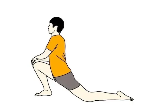 大腿部前面のストレッチになります。このストレッチを行う場合は、体の柔らかい方や膝に疾患のない方は、最初の図の様に座ってやりましょう。この際体を後ろに倒していくことで、更に伸ばすことができます。