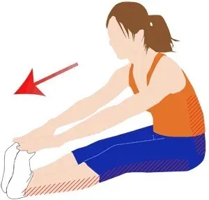 次は下肢後面の筋肉を伸ばしていきます。最初の図の様に、両足を閉じた状態でゆっくりと体を前に倒していきます。この際に気を付けることは、痛を感じる限界まで伸ばさないことがポイントになります。痛みを感じる所まで体を倒したら、その状態から少し手前まで体を起こします。限界付近まで体を倒して伸ばそうとすると、痛みで伸ばしたい場所の脱力を行うことができないため、限界より少し手前で伸ばす方が効果が高くなります。