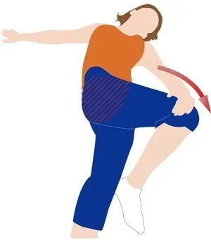 体の硬い方は2番目の図の様に、立った状態で片足を持ち、大腿部前面を伸ばすようにしていきましょう。筋肉が硬い状態で、無理に座って伸ばし続けると、四頭筋を傷める場合やこむら返り等を起こすことがあるため、気を付けましょう。