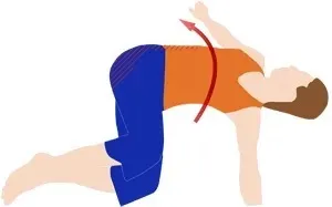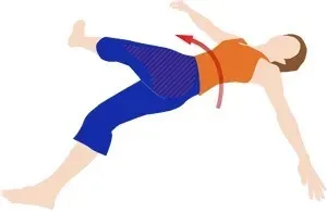 腰部の捻り運動で一番メインになるストレッチになります。上の図では股関節を90度まで曲げてから、膝を横に倒して捻りを加えていますが、この股関節の角度が変わることで、伸ばせる箇所が変わってきます。股関節45度付近まで曲げた後、捻りを加えていくと、背部から臀部にかけて幅広く伸ばすことができます。逆に股関節を120度位まで曲げてから、捻りを加えていくと、仙腸関節付近を伸ばすことができます。このように股関節の角度を変えることで、伸ばしたい場所を調節できるのが、このストレッチの特徴でもあります。